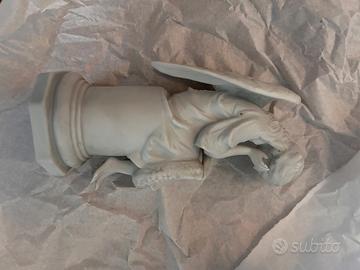 Vendo raffinata scultura decorativa raffigurante un angioletto in posa contemplativa che tiene tra le mani una ghirlanda. Realizzata in Ceramica opaca di alta qualità, la statuina si distingue per la cura nei dettagli, dalle piume delle ali ai lineamenti delicati del viso.