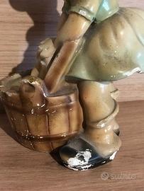Condizioni: La statuetta presenta segni evidenti di usura e scrostature della vernice, in particolare sui bordi del mastello e sulla base, il che è tipico degli oggetti in gesso o materiali simili del periodo.