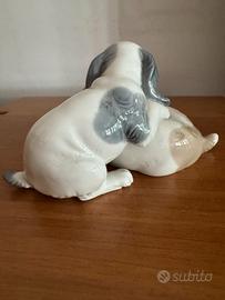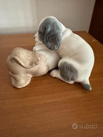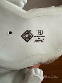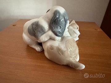 Splendida statuina in pregiata porcellana spagnola NAO by Lladró, intitolata "Svegliati" (Wake Up), modello n. 0385. Il pezzo raffigura due teneri cuccioli di Cocker Spaniel che giocano insieme. Realizzata a mano in Spagna e firmata alla base, questa scultura è stata lanciata nel 1983 ed è attualmente fuori produzione (Retired), il che la rende un pezzo da collezione molto ricercato. Marca: NAO by Lladró Modello: #0385 Materiale: Porcellana lucida dipinta a mano Dimensioni: Altezza circa 9 cm, lunghezza circa 15 cm Condizioni: Eccellenti, senza crepe, sbeccature o restauri (come da foto). Perfetta per collezionisti Lladró o come idea regalo elegante per gli amanti dei cani. #lladro #naobylladro #porcellana #vintage #collezionismo