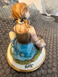 Elegante statuina in porcellana artistica italiana Capodimonte, raffigurante una bambina seduta con cestino.
