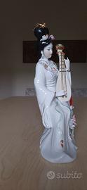geisha giapponese con strumento a corde. Statuina in porcellana lucida dipinta a mano. Altezza cm. 28