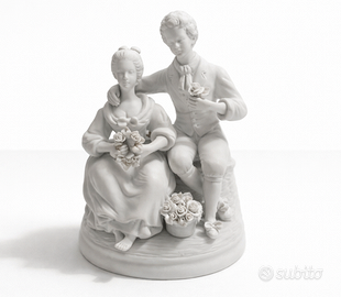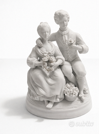 Statuina in porcellana biscuit (opaca) raffigurante scena galante. Oggetto decorativo vintage risalente agli anni '60.