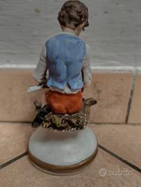 Splendida statuina in pregiata porcellana di Capodimonte, raffigurante un giovane pastorello/artigiano seduto su un tronco, intento a lavorare il legno con un coltellino.