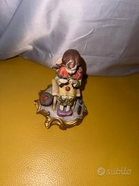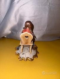 Deliziosa statuina in porcellana raffigurante una bambina seduta su una sedia mentre lavora a maglia, con gomitoli e cestino accanto.