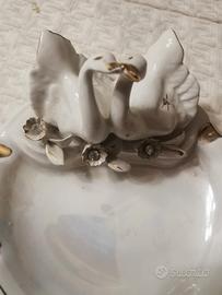 In vendita un affascinante soprammobile inporcellana italiana, realizzato nel rinomatostile Capodimonte. Questo pezzo vintage, risalente agli anni '60 o '70, raffigura una romantica coppia di cigni, simbolo di amore e fedeltà, con delicate decorazioni floreali e preziose finiture inoro zecchino
