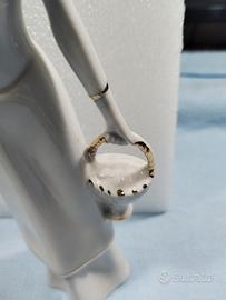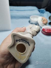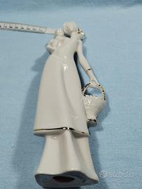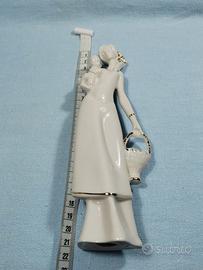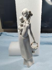 Splendida statuina vintage in porcellana artistica (Kunstporzellan) del marchio Zumas, caratterizzata da uno stile moderno, fluido ed elegante. Il pezzo raffigura una madre che tiene in braccio il suo bambino mentre porta un cesto, arricchita da raffinati dettagli rifiniti in oro zecchino sui profili delle vesti, dei gioielli e del cesto. Marca: Kunstporzellan Zumas (marchio presente sulla base).
