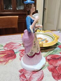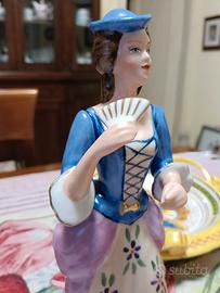 Caratteristiche del pezzo Soggetto:Dama con ventaglio e cappellino, vestita con un corpetto blu intrecciato e un'ampia gonna decorata con motivi floreali stilizzati. Stile:Riprende il gusto rococò del XVIII secolo, tipico delle grandi manifatture europee come Meissen o Dresda, ma reinterpretato in chiave più moderna (probabilmente metà del XX secolo). Materiale:Porcellana policroma invetriata, con decorazioni applicate a freddo o sottovetrina.