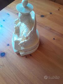 Elegante statuina orientale raffigurante una figura imperiale seduta sul trono finemente lavorata con dettagli floreali su abito e corona realizzata in resina effetto avorio. Probabile produzione asiatica anni 70/80. Altezza 26 cm. In ottime condizioni senza crepe o rotture. Perfeta come oggetto decorativo da collezione o per amanti arte orientale