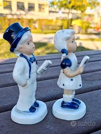 Statuine in ceramica Capodimonte Bambino e bambino che cantano con in mano lo spartito Ceramica blu e bianca e marchiatura sotto il piedistallo N Capodimonte Ottime condizioni come nuovi Altezza 14 cm