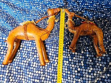 Cammelli, due statuette decorative di cammelli in pelle, Le statuette sono realizzate a mano in pelle conciata, con cuciture visibili lungo i bordi.