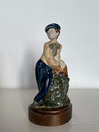 - giovane ragazzo appoggiato; berretto e pantaloni blu e appoggio verde finitura glossy. Base in legno ovale cm. 8,8x7,2x2,5.