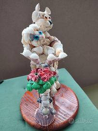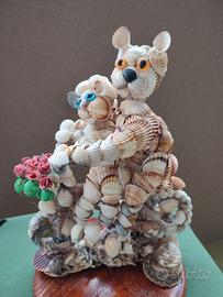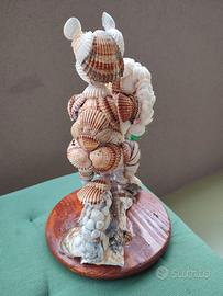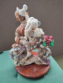 Statuetta originale realizzata interamente e mano con conchiglie raffiguranti "Lui e Lei in bicicletta", base in legno diametro cm 22 altezza cm 35