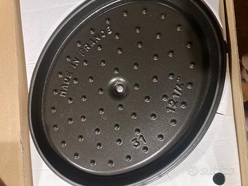 Vendo pentola originale Staub in ghisa smaltata nera ovale 31 cm nuova mai usata in scatola originale.