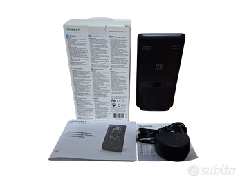 Stazione meteo Oregon Scientific Venus radiocontrollata con varie funzioni fra cui ora, data, temperatura, umidità, fase lunare, previsione del tempo, allarme ghiaccio, allerta meteo, con scatola e alimentatore, senza sensore esterno, in buone condizioni a 40 euro.
