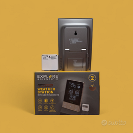 Stazione meteo orologio Oregon Scientific / Explore Scientific WSH 5001 retroilluminata, radiocontrollata con temperatura e umidità interna ed esterna, previsione meteo, fase lunare e allerta, sensore e alimentatore compresi, nuova a 50 euro.