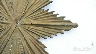 Stella ornamentale in metallo, realizzata a rilievo con lavorazione a raggi. L’oggetto è dotato di due staffe laterali originali per il fissaggio, che suggeriscono un utilizzo come elemento decorativo architettonico o arredo sacro (chiesa, cappella, confraternita) oppure come decorazione da parete.
