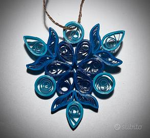 Stella di Natale realizzata interamente a mano con la tecnica del quilling, utilizzando fasce di carta di diverse colorazioni ricoperte da glitter argentato. Perfetto come addobbo per l’albero, decorazione casalinga o da abbinare a biglietti e bomboniere natalizie.