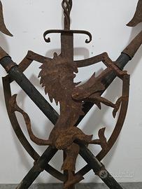 Stemma ornamentale in ferro battuto raffigurante uno scudo con grifone rampante, sormontato da una spada centrale. Ai lati sono presenti due mazze con asta in legno modificato e testate in ferro, incrociate sullo sfondo, che rafforzano il carattere araldico e medievale dell’insieme.