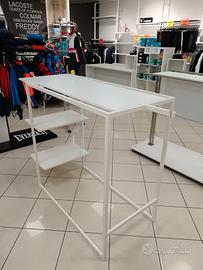 Gondola stender per abbigliamento. Adatta sia per appendere che per esposizione in mensola. Struttura artigianale in ferro verniciato e mensole in legno compensato verniciato bianco. Misure lunghezza max 162cm, larghezza max 64cm per altezza 120cm. Prezzo di acquisto originale €286,00 . Disponibili 2 pezzi. Ritiro in loco. Piccolissime smussature in alcuni angoli delle mensole.