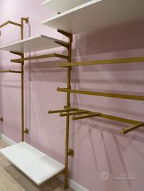 Stender negozio a muro colore oro modulare (da comporre come si desidera) composto da 6 mensole, 6 sbarre appendiabiti e 2 sbarre per 4 appendiabiti frontali.