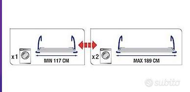 Bracci in acciaio verniciato con polveri epossidiche, regolabile e richiudibile, angoli in plastica. La griglia telescopica permette di aumentare la lunghezza del bucato Si estende fino a 20 m. Dimensioni da cm 120 a 192 x 55 x 30H .