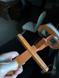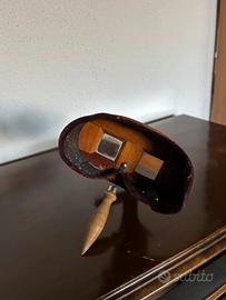 Elegante visore stereoscopico portatile in stile Holmes, completo di paraluce rivestito in velluto e manico in legno tornito. Il pezzo riporta le incisioni originali delle date di brevetto: