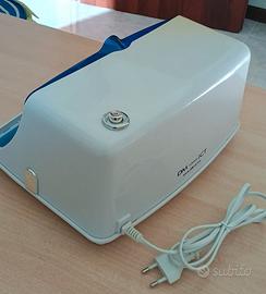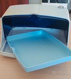 Sterilizzatore a raggi ultravioletti e ozono, è grande: largo 30 cm X 23 e altezza 16. Usato poco finché è servito a sterilizzare parti del dispositivo per Aerosol. Funziona perfettamente, si è ingiallito un poco il lato sx esposto alla luce solare, lo tengo sulla finestra.