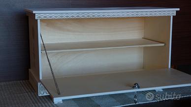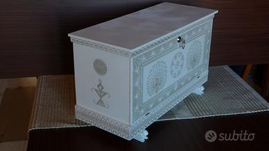 cassapanca stile sardo legno di pioppo finitura acrilica bianco opaco sfumato . incisione al laser misura 59 cm larghezza, 25 cm profondità, 34 cm altezza