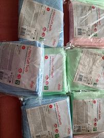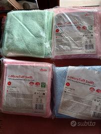 Vendo stock di 11 confezioni di panni in microfibra r-MicroTuff Swift, la linea eco-sostenibile di Vileda realizzata con il 100% di materiale riciclato. Ideali sia per uso domestico professionale che per attività commerciali, uffici o imprese di pulizia. Caratteristiche Principali: Quantità Totale: 11 confezioni (ogni confezione contiene 5 panni, per un totale di 55 panni). Dimensioni: 35 x 38 cm (formato ideale per una presa ergonomica e una pulizia veloce). Performance: Rimuove fino al 99,99% di virus e batteri anche solo con acqua (testato in laboratorio). Colori inclusi nello stock: Blu: Ideale per superfici generiche e spolvero. Verde: Perfetto per cucine e aree di preparazione alimentare. Rosa/Rosso: Specifico per l'igiene dei sanitari e bagni. (La codifica a colori aiuta a prevenire la contaminazione incrociata tra i vari ambienti).