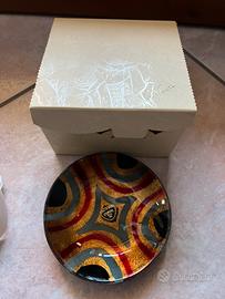Le bomboniere consistono in piattini in vetro artistico stile Murano di circa 10.5 cm di diametro, marchiati Via Veneto – Made in Italy, con finitura dorata e decorazioni colorate.