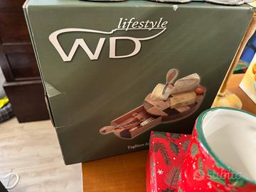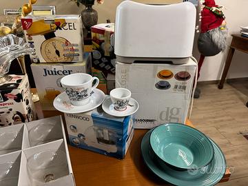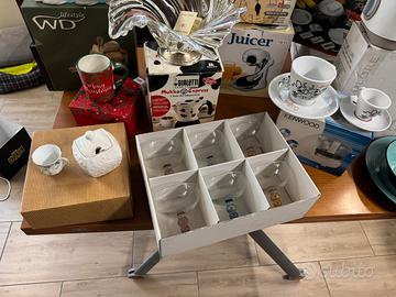 1 tazza x cappuccino + 2 tazze da caffè +zuccheriera+tazza x colazione+ 6 tazze da caffè con piattini+ 6 calici x macedonia/gelato+ 3 calici x prosecco + bilancia x alimenti+ trita tutto keenwod + tosta pane philips ( senza scatola) + spremi agrumi in acciaio+ trita verdure completa di accessori + Moka bialetti per cappuccino+ tagliere x formaggi con accessori + centro tavola cristallo/ argento + 6 piatti piani + 6 piatti fondi colorati + soprammobile dorato per un totale di 17 scatole
