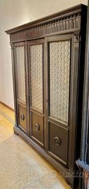 Tre ante con vetri lavorati a cerchi, legno massello, scenografico.