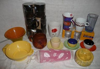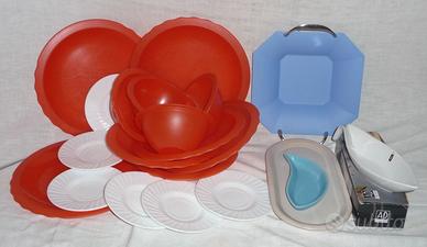 In blocco, accessori per la casa, la tavola, la cucina... - 11 piatti e coppe rossi in plastica, Snips design by Pedrizzetti (usati ma ottimi) - 6 piattini porcellana bianchi Harmonia made in Spain - 1 vassoio porta biscotti dolci ecc. azzurro - 1 piatto portata semi ovale smaltato grigio - 1 antipastiera smaltata azzurra - 1 antipastiera porcellana bianca AD Trend - 3 coppe in plastica vari colori - 10 tazze vario tipo - 4 bicchieri vetro - 3 tazzine caffè con piattini vari colori - 2 bicchieri violetto in plastica - 4 coppette per pinzimonio smaltate gialle - 1 vaso nero cubico ceramica smaltata - 6 sottobicchieri rossi plastica - 1 vassoio rettangolare acciaio con copertura plastica trasparente - 1 custodia per pane (porta pane) o altro Vendo il blocco, tutto a €30. Zona Rovereto (TN). Tf. 3389292792 Vedi altri miei annunci cliccando qui sotto sulla casella "Annunci online".