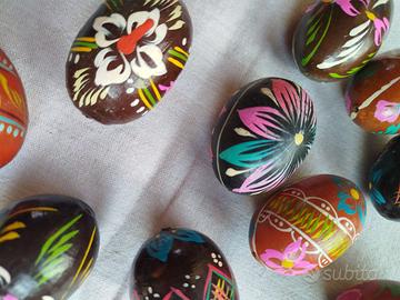 36 uova decorative per Pasqua : 1 uovo in porcellana Royal Copenaghen, 12 uova in legno dipinte a mano, 14 uova vere decorate e dipinte a mano, 1 uovo di metallo decorato, 1 uovo in legno dipinto a mano con icona russa e piedistallo, 3 uova in ceramica vecchia Lodi, 4 uova in cartone