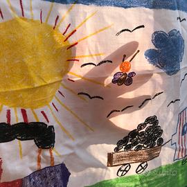 Il motivo a fantasia (paesaggio campestre con locomotiva, disegnati da un bambino), è in diversi colori su fondo bianco, presente solo su di un lato. Il motivo decorativo si ripete in altezza 4 volte, in fasce orizzontali di H 38 cm. ca. Un solo telo di dimensioni cm. ca.: