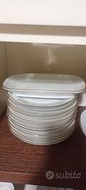 Così composto: 12 piatti piani di diametro 24 cm. + 12 piattini di diametro 18 cm + zuppiera di diametro 24 cm + vassoio di diametro 28 cm+ piccolo vassoio rettangolare di lunghezza 18 cm.La forma non è perfettamente rotonda ma lievemente ottagonale.