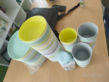 Piatti, ciotole, bicchieri e posate in plastica dura colorate, quantità 36 x tipo, in ottime condizioni, x feste