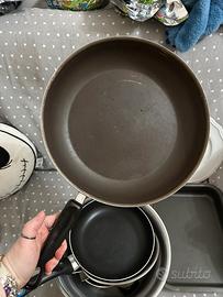 ZONA MONTEVERDE. Stoviglie varie in blocco, teglie forno, tagliere plastica, tegame in alluminio con manico in ferro, attrezzo per salse, piatto tognana e 3 padelle. Prezzo per tutto