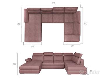 Misure: lunghezza 330 cm – altezza 102 cm – profondità 210/216 cm – dimensione letto 125×265 cm