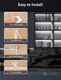 【Facile da Installare e Tagliabile】: Basta attaccare questo nastro LED su una superficie pulita e asciutta (vetro, legno, muro, metallo, ecc.), Potenti adesivi 3M e 6 clip dotate di tenere le strisce luminose in posizione saldamente ed è libero di piegarsi intorno agli angoli, senza necessità di perforazione o cablaggio. Tagliabile ad una lunghezza più corta se necessario.