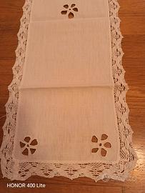 Striscia arredo in cotone ricamata a mano. Cm 24x140. Il prezzo è escluso da eventuali spese di spedizione.