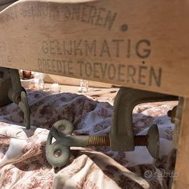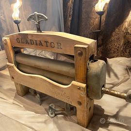 C’era una volta il lunedì del bucato… Il profumo del sapone di Marsiglia aleggiava nell’aria, mescolandosi a quello dei panni stesi al sole. In un angolo della stanza, grande e instancabile, troneggiava questo grande strizzapanni manuale Gladiator, testimone di un tempo in cui il bucato era un rituale condiviso, quasi solenne. Le mani esperte delle donne lo giravano con ritmo deciso, mentre i rulli stringevano le stoffe, lasciando cadere l’acqua in una bacinella sotto al tavolo. Realizzato in legno massello e metallo pesante, è un oggetto importante per dimensioni e presenza, e gira ancora con sorprendente fluidità - è stato usato anche di recente, le ruote sono sporche di olio). I rulli sono in ottimo stato, antitarlo già fatto. Sulla struttura in legno compare con fierezza il nome del marchio: GLADIATOR. Sulla parte frontale, una scritta in olandese recita: “I rulli di questo strizzapanni sono garantiti 1 anno per uso domestico normale. Un’altra scritta invita a distribuire il bucato in modo uniforme: “Inserire il bucato distribuendolo uniformemente su tutta la larghezza.” Queste indicazioni ci raccontano non solo la lingua dei suoi utenti originari (fiamminghi), ma anche la cura e l’attenzione con cui veniva spiegato il funzionamento, per evitare errori e garantire una lunga vita allo strumento. Un oggetto perfetto per chi ama il fascino autentico del passato: ideale come elemento decorativo in una lavanderia vintage, una bottega creativa o una scenografia d’epoca. Ingombro totale cm 74 x 40 x 15, molto pesante, il prezzo comprende spedizione dedicata su piccolo bancaletto.