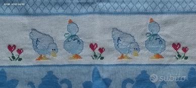 2 strofinacci a fantasia di cotone 100% ricamati a mano punto croce. Lavorazione a mano perfetta. Ricamo a punto croce filato DMC indelebile. Soggetti: Bordo floreale - ochette. Come da foto allegate. Misura: 84x60 cm. Ideale per qualsiasi regalo. Il prezzo s'intende per la coppia di strofinacci.