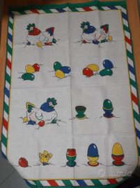 Uno con motivo allegro con galline,pulcini e portauova colorati, rifinito con bordo a righe diagonali. Misure 90x60