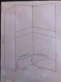 Cabina armadio ad angolo in legno con rispettivi pannelli che presentano qualche segno di usura ma in buone condizioni. Le misure sono riportate nell'ultima foto.