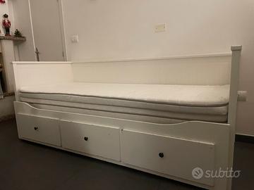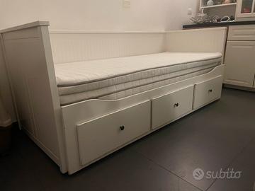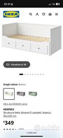 Dono struttura divano letto ikea hemnes, il divano si trasforma in letto matrimoniale. La struttura è in buone condizioni, la parte bassa frontale è un pó raschiata (come si vede in foto) ma con dei ritocchi puó tornare perfetta. Regalo un materasso. In foto ci sono le misure e i prezzi degli articoli “nuovi”