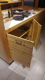 E' anche mobile contenitore, sotto il banco orizzontale ha 4 ante in legno con maniglie in acciaio laminato che aprono su spazi larghi 100 cm. e profondi 105 cm. Attualmente è smontata ed imballata, non presenta alcun tipo di graffio o rottura. Il prezzo è compreso montaggio da parte di falegname esperto ebanista, il trasporto non è compreso. La struttura si trova in un deposito a Napoli, zona Vomero. Le mensole che si vedono in foto sono asportabili, servono ad aumentare il piano di appoggio se la struttura è usata come banco da ristorazione. La struttura è completamente verniciata trasparente lucido. Fatturabile.