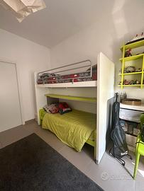 Struttura mobile, estraibile per salire sul letto superiore e riponibile per guadagnare spazio, lettino sotto dotato di ruote, doghe in legno.
