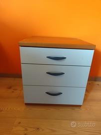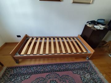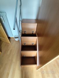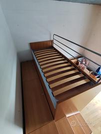 Vendo struttura letto a castello in legno. Completa di 2 letti singoli (no materassi) uno fisso nella parte superiore e uno mobile nella parte inferiore, compresi di doghe in legno, 2 comodini con 3 cassetti ciascuno. La struttura è fornita di ampi cassettoni nella parte superiore e altri più piccoli sulle scalette. Viene venduta con barra di protezione in ferro. La struttura presenta dei piccoli difetti, dovuti alla passata presenza di sticker, facilmente copribili con vernice apposita, per il resto è in ottime condizioni. Misure struttura (cm): 252 (lung.) x 190 (h) x 136 (larg.) Misure letto mobile (cm): 195,5 (lung.) x 88 (larg.) x 40 (h) Misure comodini (cm): 45 (lung.) x 45 (larg.) x 50 (h)