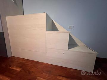 Vendo Struttura letto marca Battistella,dotata di due reti, 1 materasso, due cassettiere (sotto letto basso), doppio rivestimento arancione (uno nuovo come da foto) della barriera letto superiore. Inclusa scala con cassetti e scomparti, come da foto. Tutto già smontato, ritiro a carico dell’acquirente.